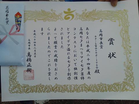 当サイトにて7月21日にご案内いたしました通り、高岡七夕まつりの「マイ七夕コンテスト」にカターレ富山をサポートする会より出展したところ、高岡市長賞を受賞致しました。